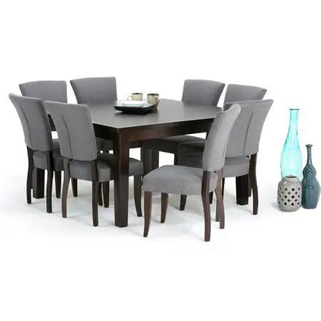 Large Dark Wood Family Dining Table with Grey Upholstery