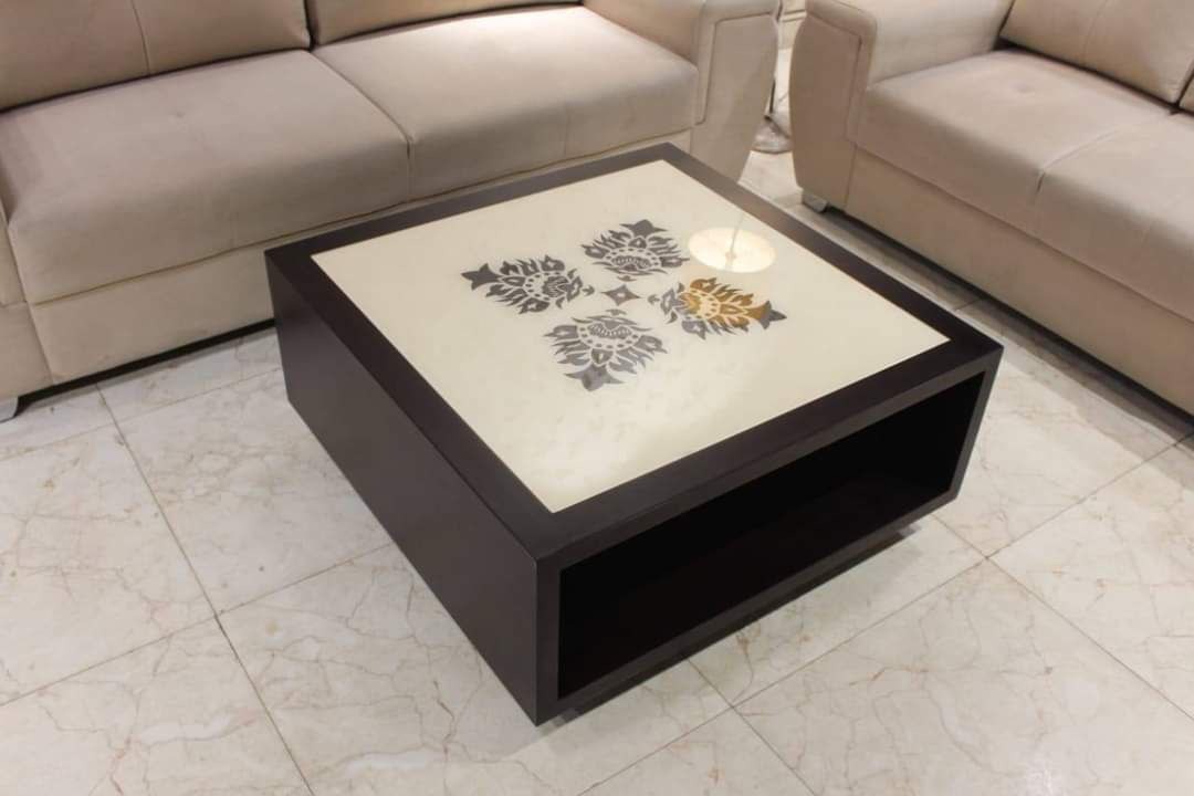 Modern Glossy White Coffee Table with Golden Leaf Design